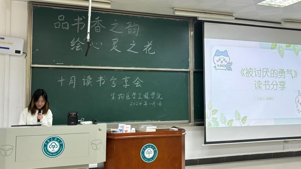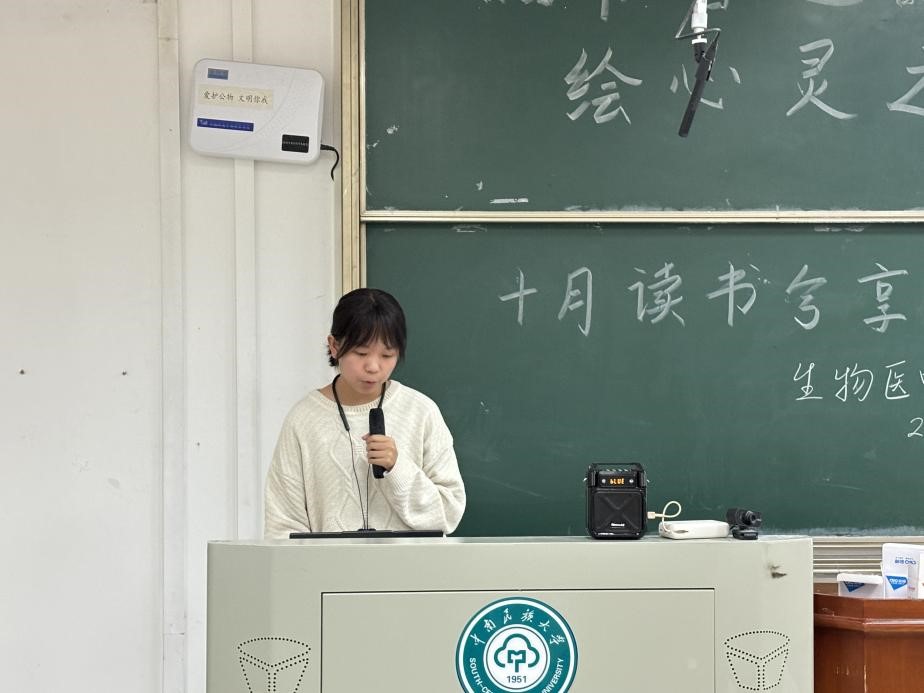 第二位分享者是來自生醫(yī)2301班的韋知行同學。她為我們帶來了一本深刻且富有啟發(fā)性的書籍——《蛤蟆先生去看心理醫(yī)生》。這本書通過講述一只深陷抑郁情緒中的蛤蟆先生與其心理咨詢師蒼鷺之間的對話,深入探討了心理健康的重要性。韋知行同學結(jié)合自己的親身經(jīng)歷,真誠地分享了她的感受與見解。她鼓勵在座的每一位同學:不要因為羞恥而隱藏自己的問題,而應該勇敢地尋求幫助,學會接納并擁抱真實的自己。