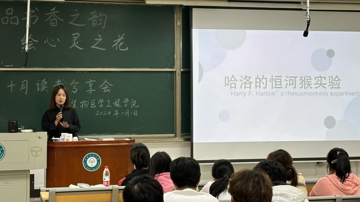 葉穎老師首先分享了羅杰·霍克寫的《改變心理學的40項研究》,并就其中哈洛的恒河猴實驗展開細致分享。該實驗通過對比鐵絲母猴與絨毛母猴對幼猴成長的不同影響,深刻揭示了身體接觸在幼猴成長過程中的不可或缺性,其重要性甚至超越了哺乳本身。她借此契機,勉勵同學們不僅要言辭上表達愛意,更要在行動上付諸實踐,向親朋好友傳遞溫暖與關(guān)懷。