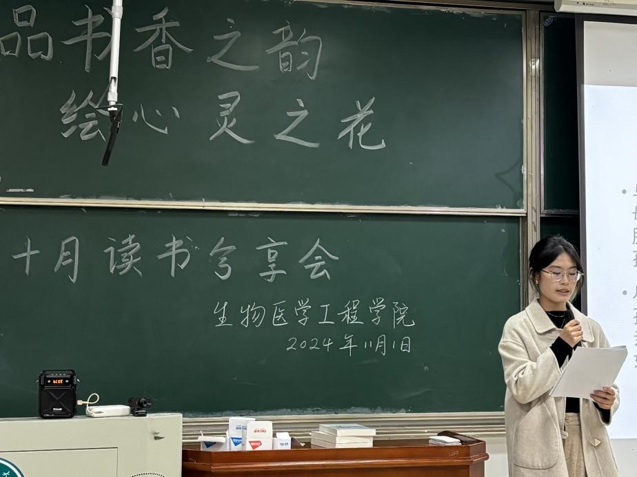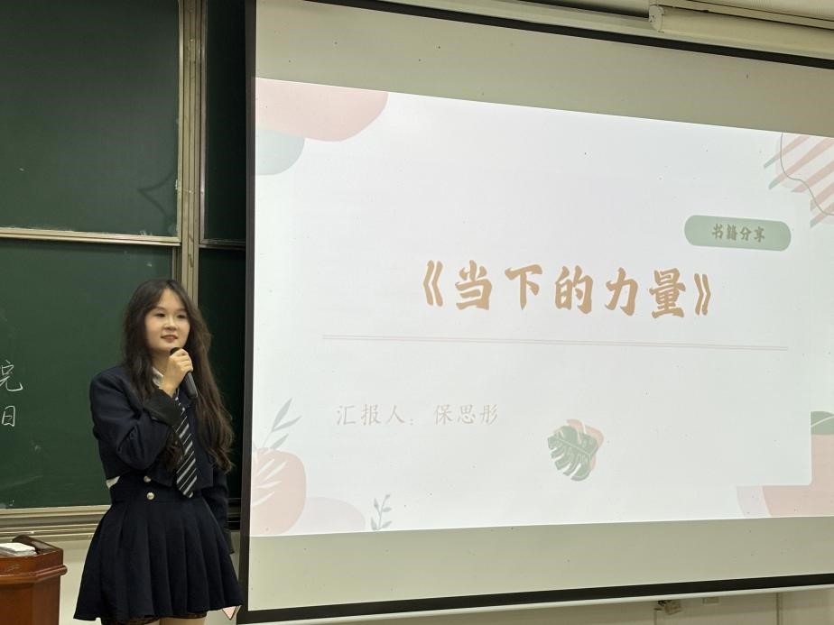 第一位分享者是生醫(yī)類2403班的的保思彤。她分享了《當下的力量》一書,介紹了書中認清時間幻象的幾個非常實用的方法,放平心態(tài)、珍惜現(xiàn)在、享受過程,感受日常生活中簡單的美好與幸福。她感悟到:“活在當下,當下有你所有想要的東西,當下也是你唯一擁有的東西”。