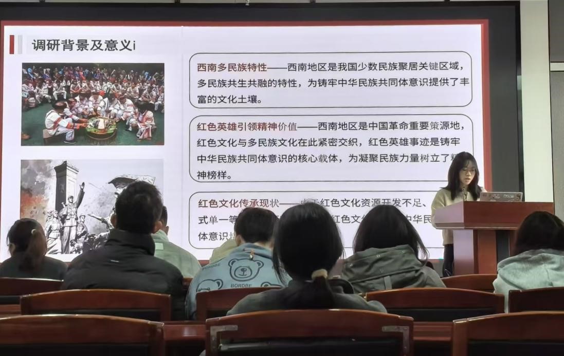本次答辯會共有八支隊伍參與,各團隊按抽簽順序依次上臺,通過圖文展示、視頻資料和數據分析等多種形式,系統展示了他們在寒假期間的社會實踐成果。其中,“蛋仔派隊”聚焦寒假愛心托管班,開展了中華民族共同體理論宣講活動,深化了民族團結教育;“溯洄從之隊”通過對川滇桂三省五地的實地調研,深入挖掘了西南地區紅色文化資源在鑄牢中華民族共同體意識中的歷史貢獻與現實價值。