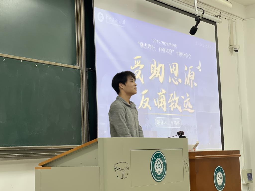 隨后,同學們結合親身經歷,分別講述了真摯感人的自立自強故事。其中2023級尚鵬輝同學以“受助思源,反哺致遠”為主題,回顧了自身的成長。他坦言,正是得益于國家助學貸款、助學金等政策的扶持,他才擁有了逐夢前行的堅實基礎。通過投身班助及學生會等實務工作,他更切身踐行并深刻理解了青年的責任,其經歷生動詮釋了一段從困惑走向篤行的進取之路,獲得了大家的一致認可。其他同學也分別結合各自經歷,分享了自身成長故事。