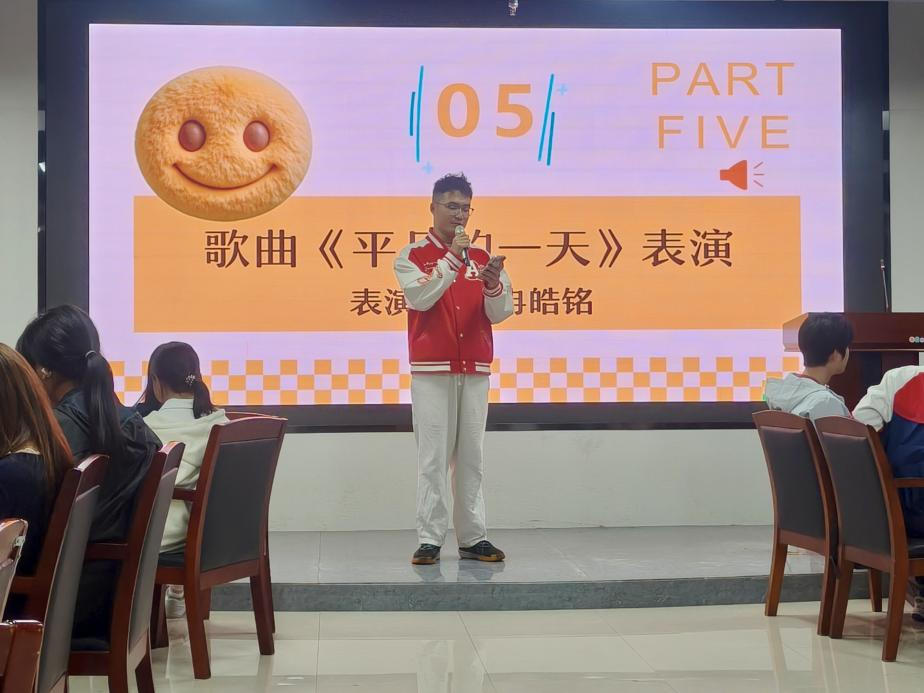 接下來,互動游戲與才藝表演輪番登場,同學們全情投入、各展所長,現場氛圍在歡聲笑語中持續升溫。“三詞成句”“正話反說”“加字游戲”“動作反做”等互動游戲接連進行,同學們積極參與、默契配合,熱鬧的氛圍讓同學們的距離快速拉近。才藝表演同樣精彩紛呈,冉皓銘同學演唱的《平凡的一天》溫暖治愈,楊帆同學和鄭曦同學合唱的《晴天》滿是青春氣息,現場氛圍輕松愉悅。