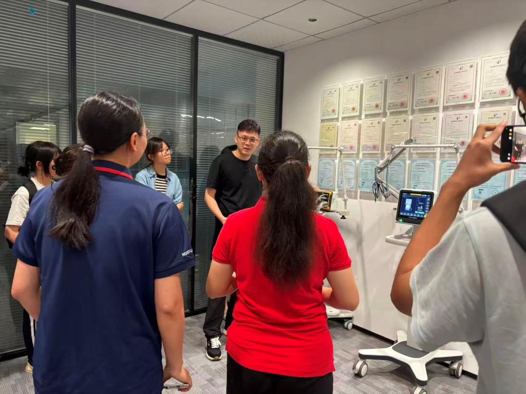 交流結束后,在李工的帶領下,我院學子走進哈維醫療參觀產品。在研發實驗室、生產組裝車間與產品測試中心的實地參訪中,學子們直觀看到了ISO13485 標準在實際生產中的落地場景——從硬件設計圖紙上的法規適配標注,到測試中心里按標準流程運行的可靠性試驗設備,再到生產線上的質量管控節點,切實理解了“醫工融合”是臨床需求、工程技術與行業標準的三方協同。