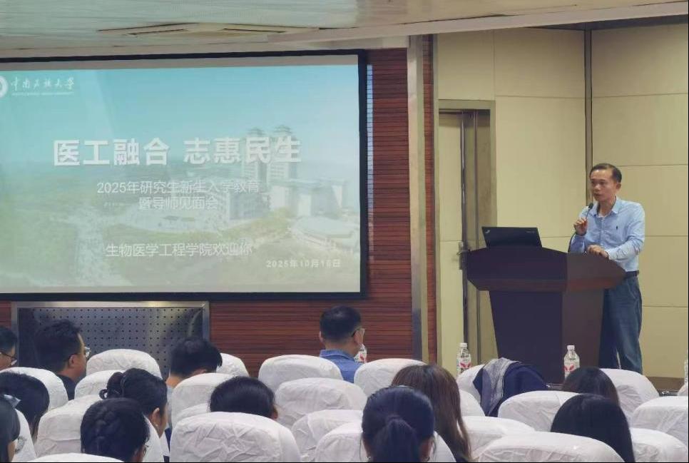 (文/程驛涵,圖/張冰洋)為深入踐行教育強國建設戰略部署,夯實拔尖創新人才培養根基,引導2025級研究生新生筑牢信仰之基、規劃學術之路,生物醫學工程學院于2025年10月15日中午在16棟2樓報告廳隆重舉行2025級研究生新生入學教育暨導師見面會。參與本次大會的有:學院黨委書記桂孫來、院長陽小飛、副院長陳軍波、副院長李旭、輔導員張冰洋,2025級研究生導師以及全體研究生新生。本次大會由學院副院長陸雪松主持。
