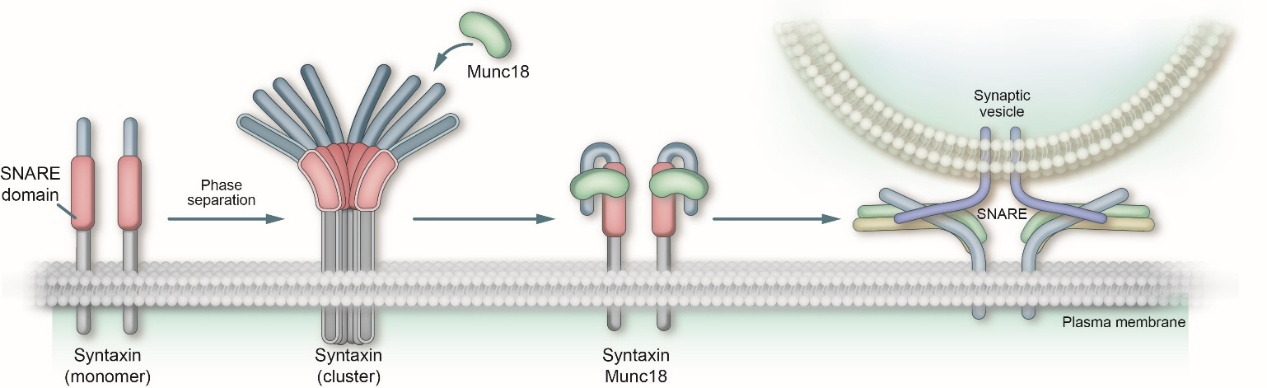 Syntaxin蛋白聚集通過其胞質(zhì)結(jié)構(gòu)域相互作用驅(qū)動相分離而形成,這些聚集結(jié)構(gòu)可作為分子儲備庫,防止囊泡過度融合。Munc18能夠結(jié)合并閉合Syntaxin的胞質(zhì)結(jié)構(gòu)域,將其從蛋白簇中物理分離,從而啟動膜融合過程。