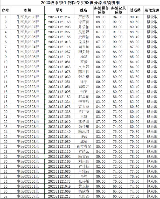 根據(jù)學(xué)校《關(guān)于做好2024年本科學(xué)生大類(lèi)專(zhuān)業(yè)分流工作的通知》文件精神,現(xiàn)將2023級(jí)專(zhuān)業(yè)分流系統(tǒng)生物醫(yī)學(xué)實(shí)驗(yàn)班擬錄取名單公示如下: