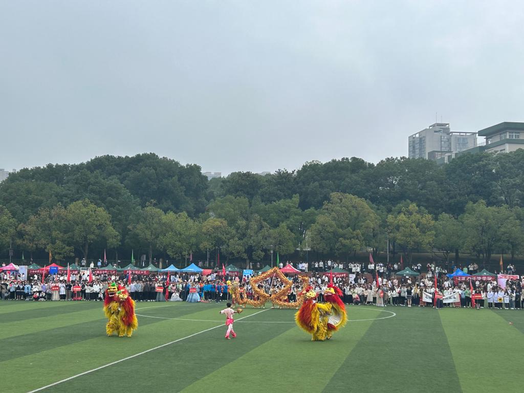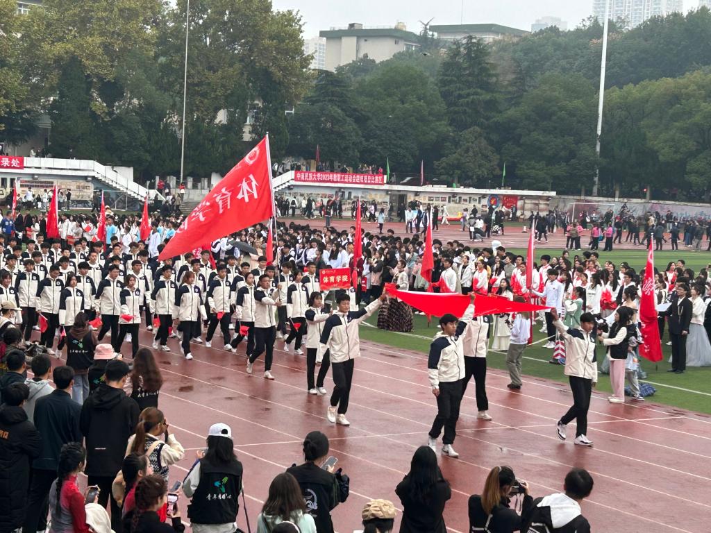 國旗儀仗隊護送國旗率先登場。伴著激昂的運動員進行曲,各學院和教工方陣隊邁著整齊的步伐,依次入場。文學與新聞傳播學院同學身著漢服,手持“文以載道,傳以致遠”的卷軸,駐停舞蹈優美典雅;音樂舞蹈學院同學身著院服,伴著鼓點翩翩起舞,展現專業水準;外語學院同學高舉國旗迎風招展,鮮艷的中國紅引燃現場氣氛;國際教育學院同學齊打武術,一招一式間展現中外交流氣象……整齊的步伐與精彩的駐停表演贏得了陣陣掌聲與歡呼聲。
