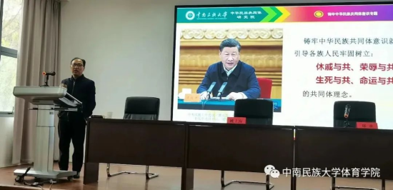 (通訊員:馮琦野)2023年3月24日下午,體育學院在體訓中心三樓報告廳舉辦第三屆“炫中華”傳統體育文化節之鑄牢中華民族共同體意識專題講座。學校中華民族共同體學院、中華民族共同體研究院院長姚上海教授就鑄牢中華民族共同體意識,加強和改進黨的民族工作展開演講,體育學院黨委副書記鄭重帶領強國班全體成員參加。