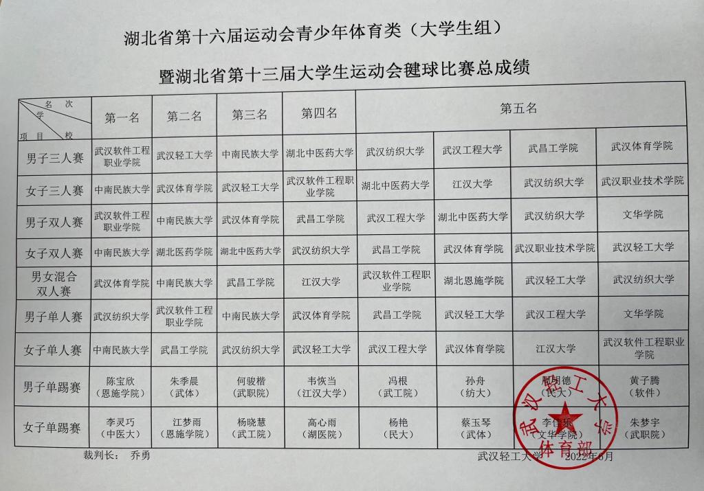 (作者:楊艷)6月25日至26日,2022年湖北省第十六屆運動會青少年體育類(大學生組)暨湖北省第十三屆大學生運動會毽球比賽在武漢輕工大學金銀湖校區體育館舉行。我校毽球隊16名運動員在領隊郝家春、教練員金寧的帶領下,經過兩天的激烈角逐,在所有9個項目的比賽中,榮獲女子三人賽、女子雙人賽和女子單人賽3項冠軍;男子雙人賽、男女混合雙人賽2項亞軍;男子三人賽、男子單人賽2項季軍;男子單踢賽和女子單踢賽第五名的優異成績。