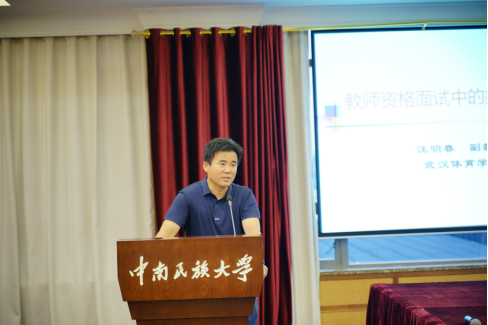 (通訊員:馬宋成)2021年6月25日晚上7點,中南民族大學體育學院在學術交流中心三樓一會舉辦了教師資格考試輔導報告會。本次會議由武漢體育學院汪明春副教授主講,體育學院院長郝家春主持,體育學院全體有意愿報考教師資格證的學生參會。