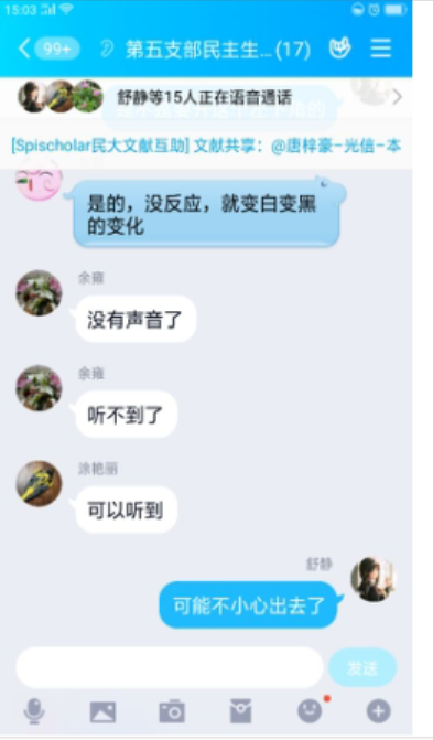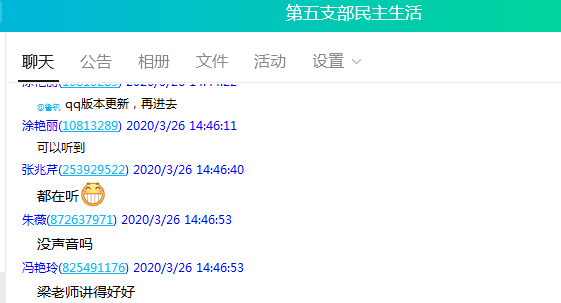 3月26日下午2點30分,外語學院教工第五支部15位黨員同志們準時在QQ群以語音會議的形式進行了遠程實時主題黨日活動(曾素英同志因侄子骨折,送孩子看醫生,請假)。黨員同志們通過網絡平臺和學習強國APP認真學習了習近平總書記在抗疫期間的5次講話和1次回信后,十幾位同志在討論會上踴躍發言,會后撰寫書面學習體會。