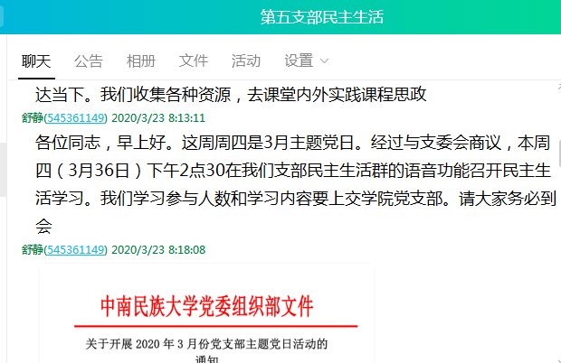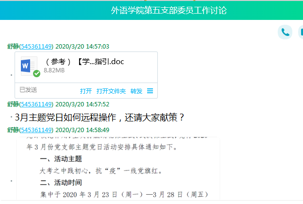 自從3月18日接到校黨委關于三月主題黨日活動的通知,外語學院第五支部支委通過“支委討論組”商議活動開展形式,并就學習步驟達成一致意見:首先在“第五支部民主生活群”號召黨員同志自學學習材料、集中時間開討論會、鼓勵黨員同志口頭和書面分享學習體會。在新冠病毒疫情防控期間,