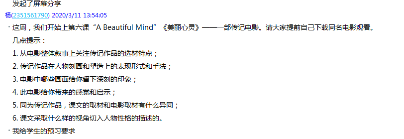 除了與研究生英語課程相關的課外互動,大英三系老師還實時向學生分享課程以外的優質英語學習資源,擴大學生英語學習視野。舒靜老師曾經分享鐘南山院士呼吸學會國際年會上的英語演講視頻,打破學生英語學習工具性考試目標的閉環,讓學生認識到英語不僅是吸收信息的渠道,更是表達思想,傳播思想的重要途徑,激發學生英語學習的內生動力。