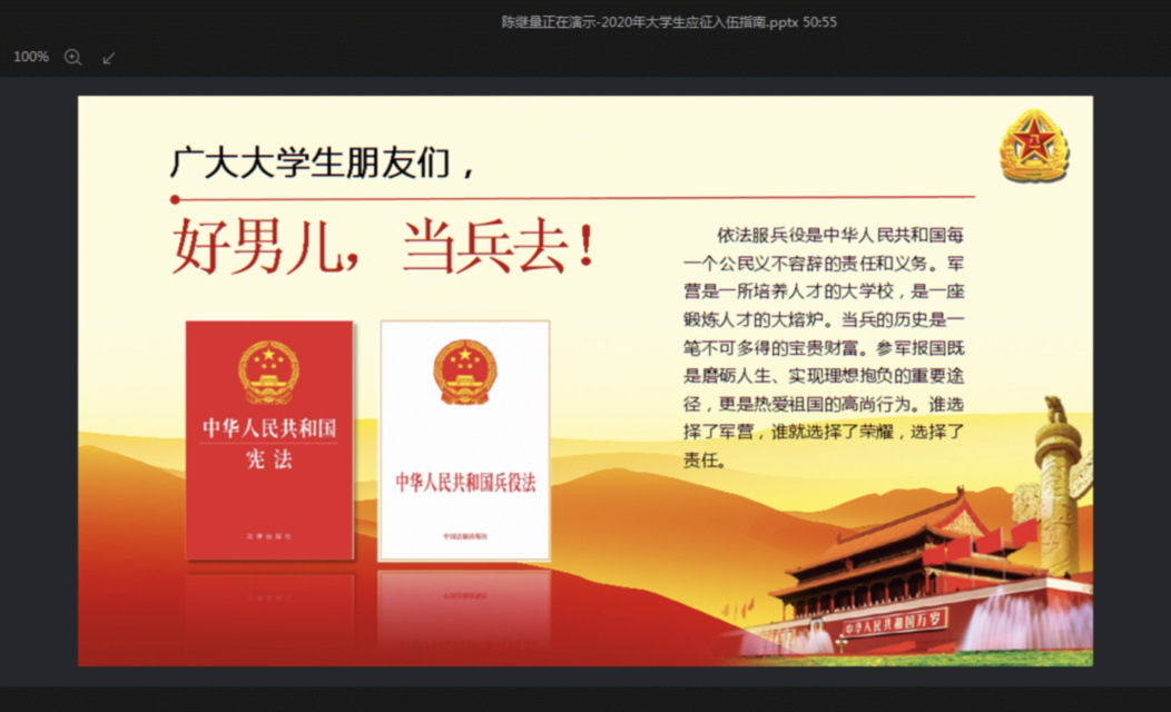 同時,陳老師也簡單介紹到大學(xué)生參軍的優(yōu)惠政策,包括優(yōu)先優(yōu)待、選拔培養(yǎng)、復(fù)學(xué)升學(xué)以及退役就業(yè)等多方面優(yōu)勢。疫情之下,就業(yè)形勢不容樂觀,應(yīng)征入伍不失為提升個人素質(zhì)、提高就業(yè)競爭力的一種優(yōu)質(zhì)選擇。