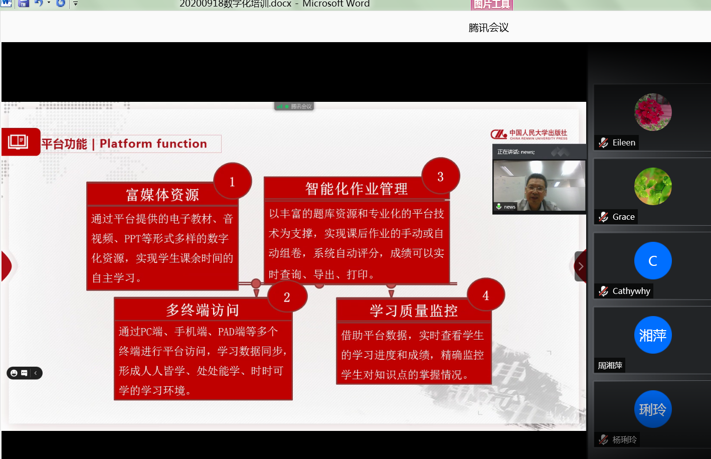 中南民族大學外語學院大英三系負責全校碩士博士公共英語教學,上學期新冠疫情肆虐時期,大英三系全體教師在人民大學出版社蕓窗數字化平臺支持下順利為我校碩士研究生提供優質研究生英語課程。在新學期即將上課之際,大英三系全體教師響應數字化教學的時代要求,繼續深化對蕓窗數字化平臺使用的認識。 2020年9月18日早上10點,人民大學出版社在騰訊會議上為大英三系6位教師開展了一場深入細致的蕓窗數字教材平臺遠程培訓會,培訓會由人民大學出版社外語分社策劃編輯程子殊老師主持,數字部王新文老師主講。在培訓會上,大英三系老師結合上學期蕓窗平臺使用體驗,更系統全面地了解蕓窗平臺豐富多媒體資源的利用、智能化作業和測試生成和管理以及學習質量監控等問題。為高效開展研究生英語線上線下混合式教學做好了數字技術準備。培訓會后,大英三系老師結合自己使用體驗和未來需求與王老師進行深入文字和語音交流討論。