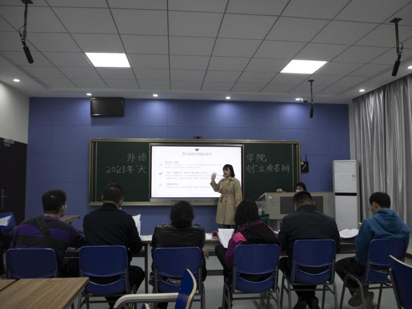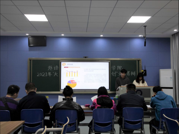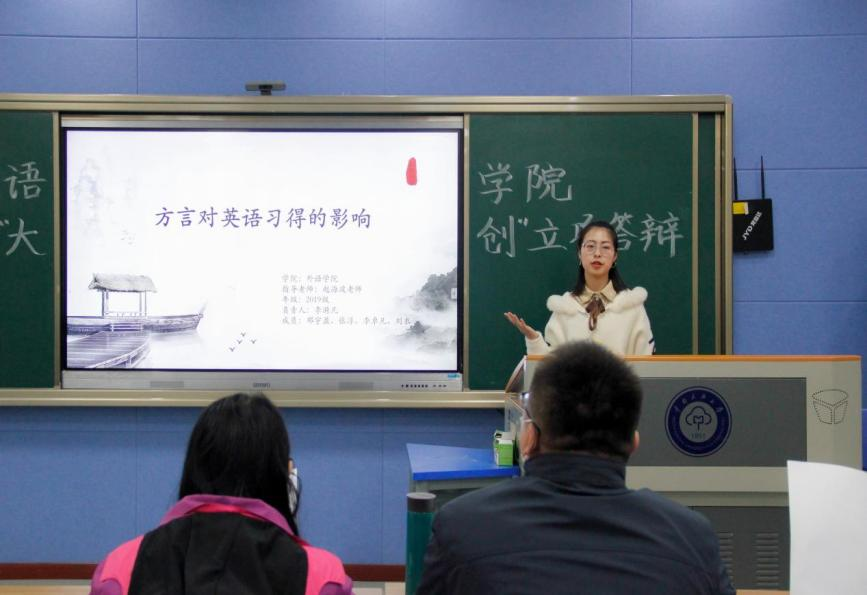 答辯分為項目展示和評委提問兩個環(huán)節(jié)。四組代表圍繞語言學習、教育、旅游經(jīng)濟與地域特色等,結合PPT逐一闡述研究目的、研究困難及解決方案。