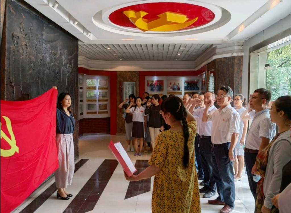 活動伊始,黨員們來到報告團榮譽室,由教工第五支部書記舒靜領誓,眾人面朝著鮮艷的黨旗,進行了重溫入黨誓詞儀式。