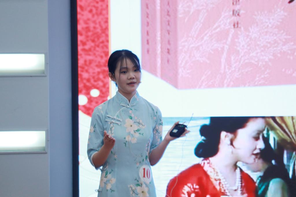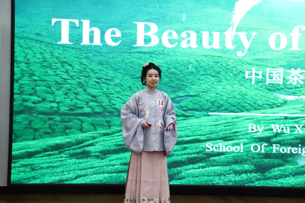 在下午舉行的英文賽道決賽中,25位選手用流利的英語(yǔ)向觀眾們描繪了豐富多彩的中華文化,有精美的民間工藝、有古老的藝術(shù)…外語(yǔ)學(xué)院的陳曉同,從哲學(xué)發(fā)展延伸到中華歷史文化;生命科學(xué)學(xué)院的阿迪思身著蒙古族服飾,用一首家鄉(xiāng)的蒙古族歌曲,演繹中華之美;中華民族共同體學(xué)院的馬慶慶講述了茶文化,帶我們領(lǐng)略源遠(yuǎn)流長(zhǎng)的傳統(tǒng)茶道;剛果(金)留學(xué)生魯安以“中國(guó)傳統(tǒng)文化”為題,詮釋了入鄉(xiāng)隨俗之妙,向觀眾們展示了外國(guó)友人視角的漢服之美。