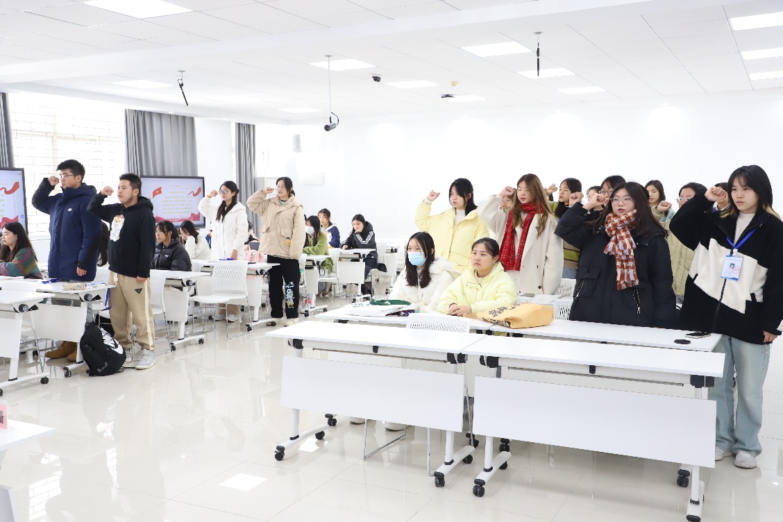 學生發言結束后,方明勝與陳驪姍為新學生記者頒發了記者證,副團長陳欣蕾帶領新記者進行了莊嚴的宣誓。