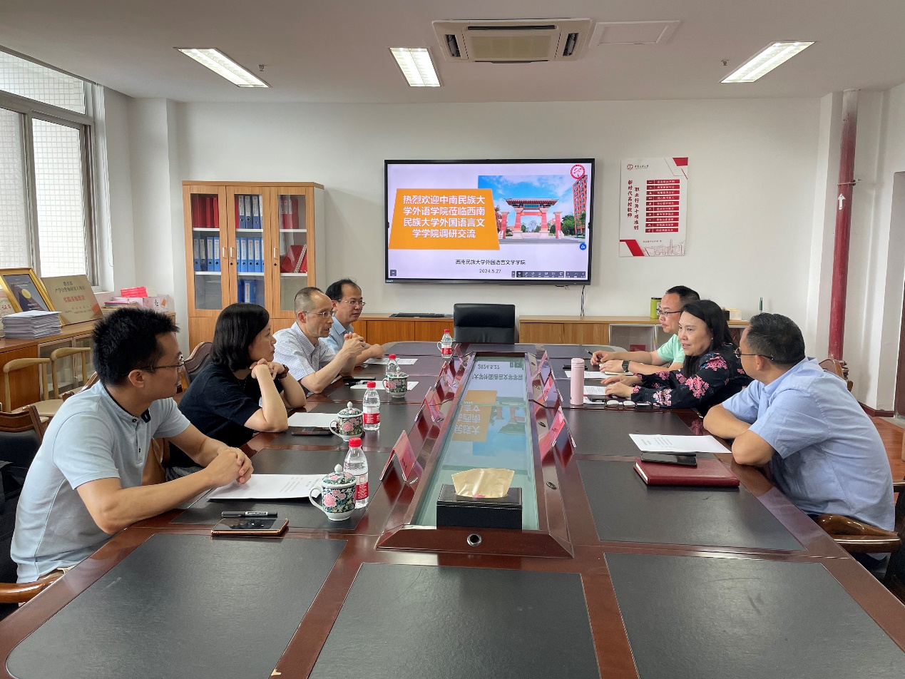 5月27日下午,學(xué)院院長易立新帶隊(duì)赴西南民族大學(xué)外國語言文學(xué)學(xué)院調(diào)研交流。西南民族大學(xué)外語學(xué)院院長吳永強(qiáng)、副院長鄧忠、秦祖宣出席了此次交流會。