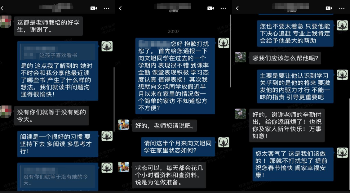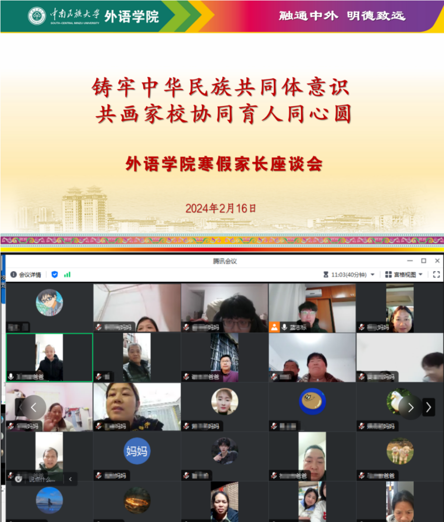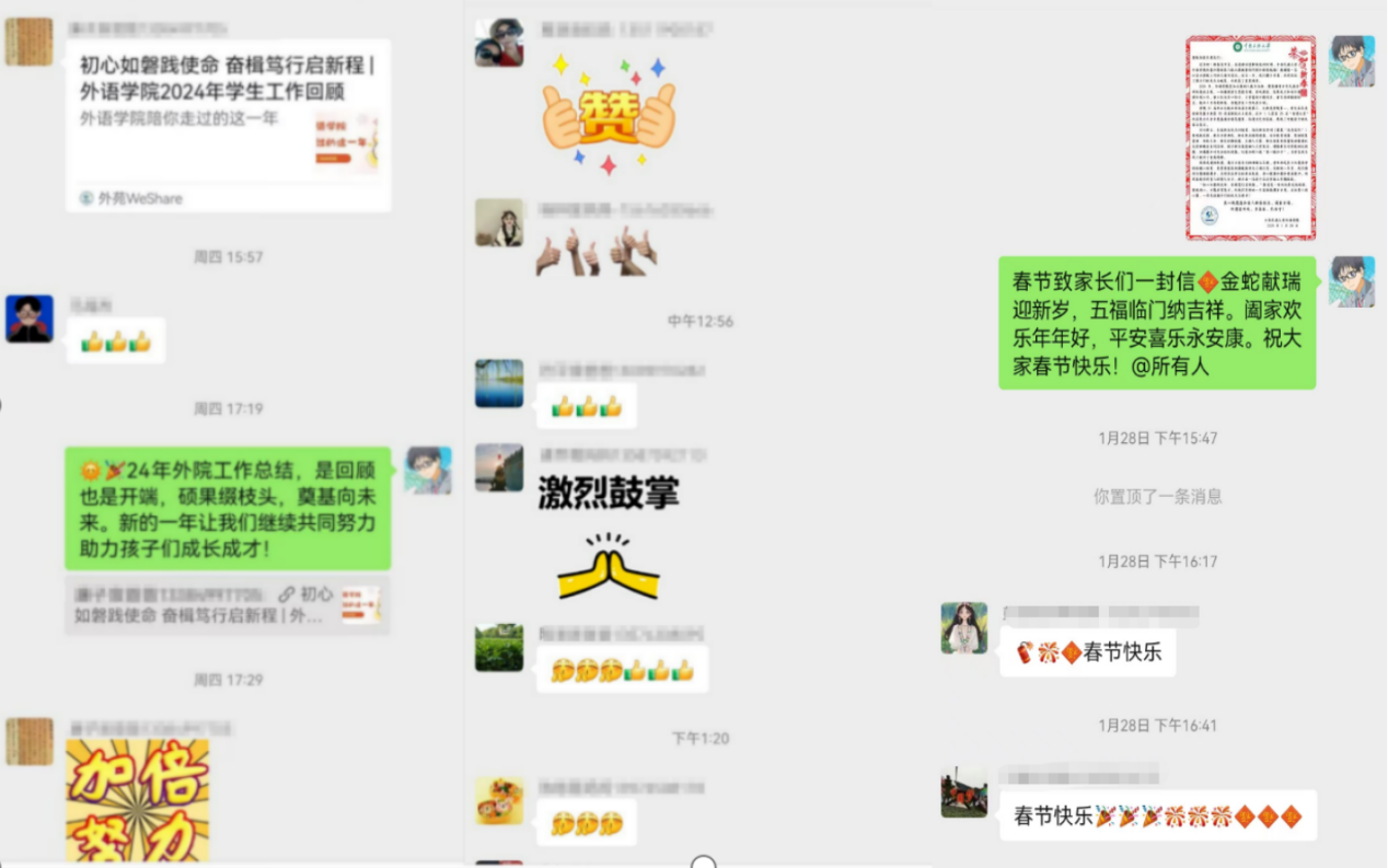云端家訪,育夢(mèng)起航。學(xué)院各年級(jí)也通過(guò)線上平臺(tái)多渠道搭建起家校溝通橋梁,落實(shí)“云家訪”全覆蓋。輔導(dǎo)員、班導(dǎo)師開(kāi)展線上一對(duì)一視頻家訪,與家長(zhǎng)進(jìn)行深入交流,傳遞學(xué)校對(duì)學(xué)生培養(yǎng)的重視和關(guān)愛(ài),認(rèn)真了解家長(zhǎng)期許,幫助學(xué)生家長(zhǎng)了解學(xué)生在校情況;特別組織召開(kāi)“鑄牢中華民族共同體意識(shí) 共畫家校協(xié)同育人同心圓”主題線上家長(zhǎng)座談會(huì),詳細(xì)介紹學(xué)院過(guò)去一年所開(kāi)展的學(xué)生工作和取得的突出成績(jī),為家長(zhǎng)答疑解惑,筑牢家校協(xié)同育人平臺(tái);以短信方式發(fā)送“寒假致家長(zhǎng)的一封信”、在家長(zhǎng)群發(fā)送“外語(yǔ)學(xué)院2024年學(xué)生工作回顧”以及“春節(jié)致家長(zhǎng)的一封信”,落實(shí)育人責(zé)任,提升育人溫度,拉近家校距離。
