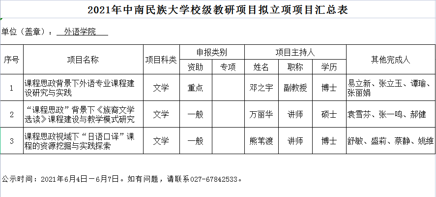 外語學院 2021年中南民族大學校級教研項目擬立項項目公示