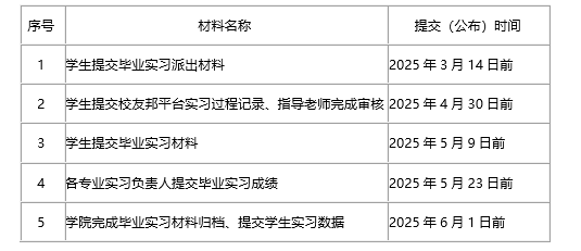 參加集中實習的學生于2025年2月28日前完成報名,報名方式詳見學院集中實習招募通知;并于2025年3月14日前按照集中實習各基地帶隊老師要求,完成集中實習派出工作。