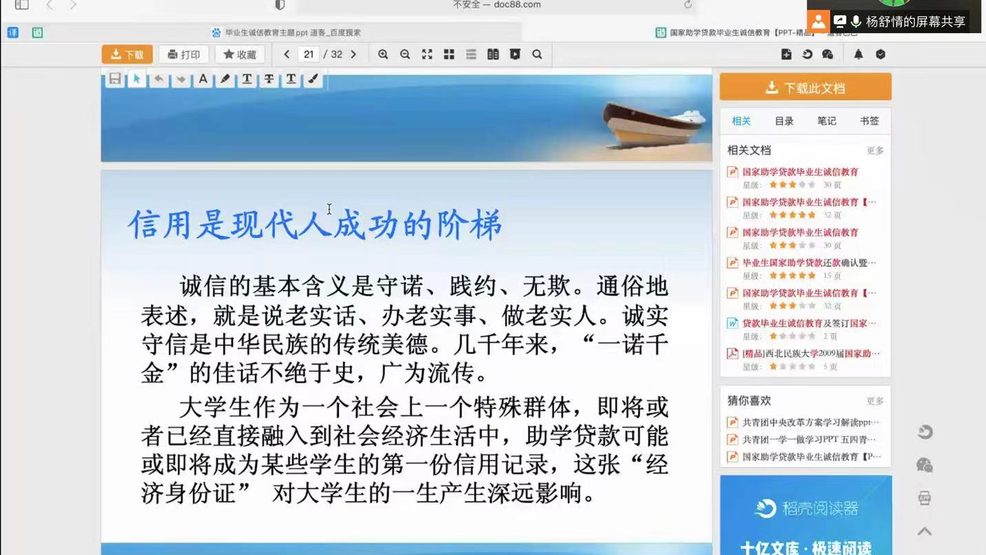 為做好生源地、校園地助學貸款還款工作,進行“貸款助學·信用助人”生源地校園地誠信還款教育宣傳,增強同學們的誠信意識,6月1日下午,我院畢業生誠信還款教育年級大會于線上召開,2017級全體同學參加,輔導員楊舒情主持會議。