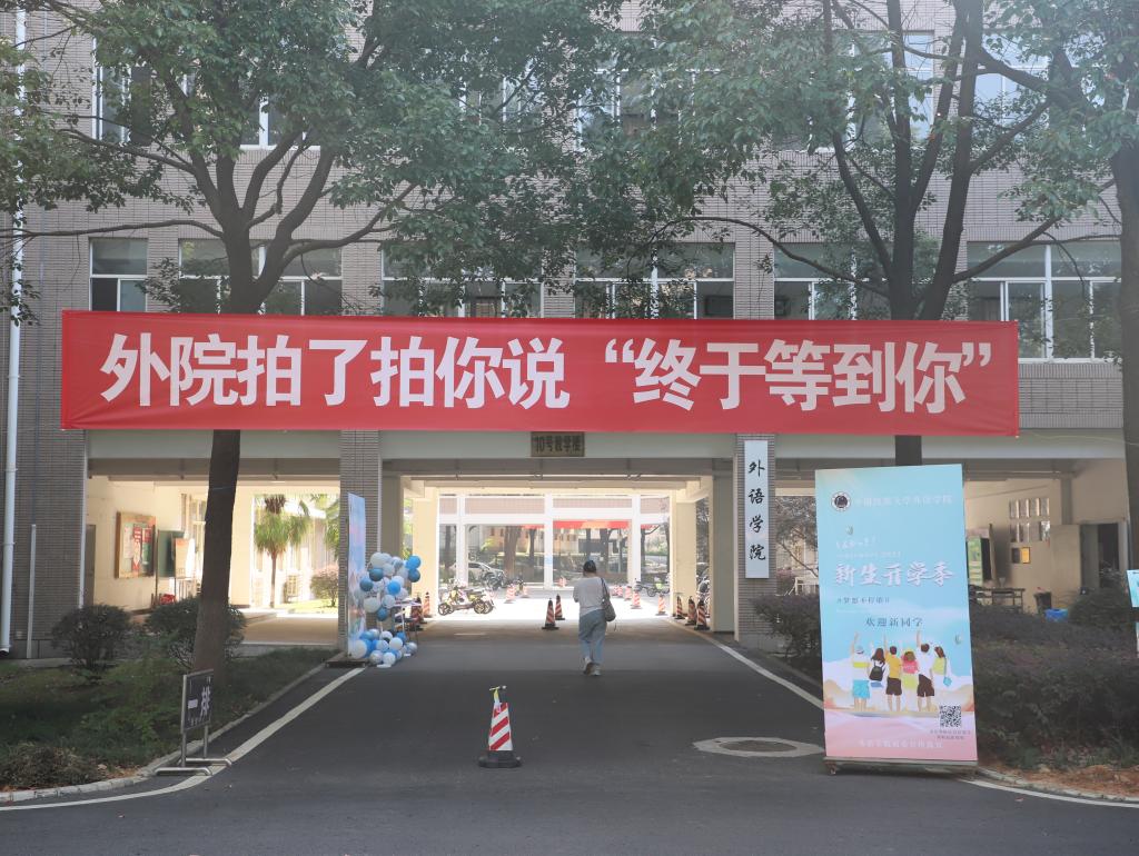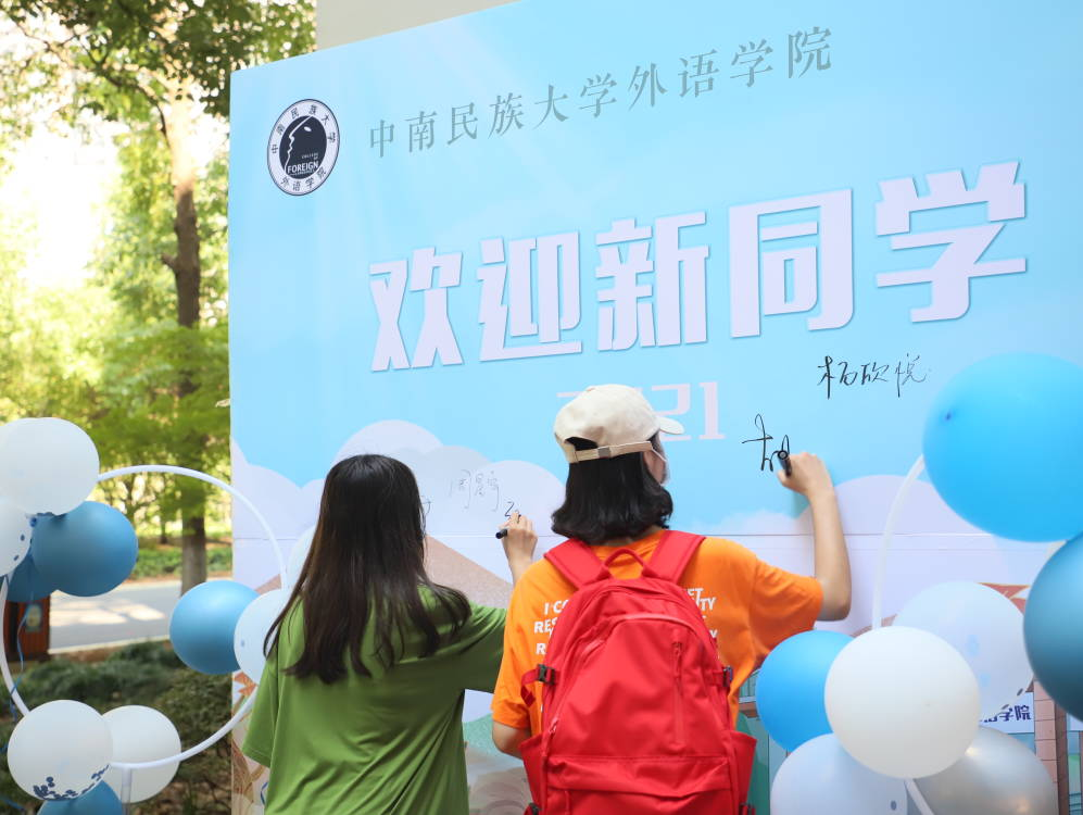 (新生在我院的迎新簽名板上簽名。 外院學生匯 供圖)
