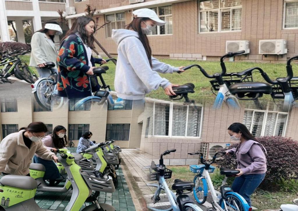 (志愿者們將共享單車有序擺放。吳秀禎、彭娣攝)