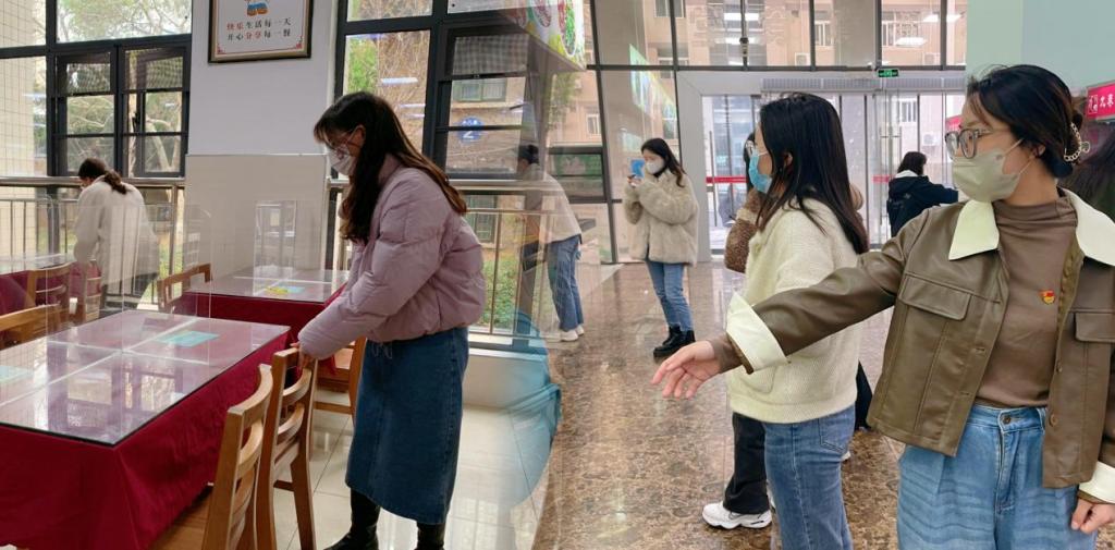 (志愿者們在食堂整理桌椅、引導排隊。孫慧琴攝)