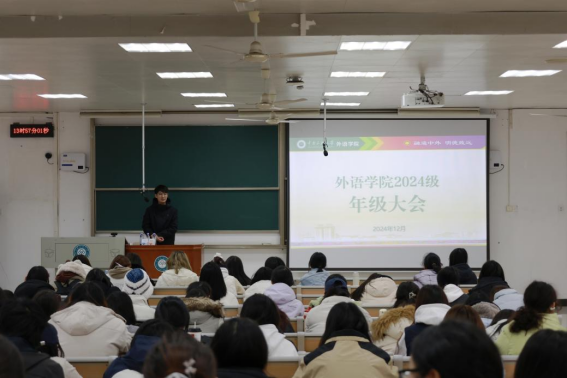 12月12日下午,學院于15號教學樓205教室組織召開2024級本科生年級大會。本次會議特別邀請了校國際處項目管理與外國專家科科長李曉辰老師,學院商務英語系蔡蔚老師,2021級輔導員陳驪姍老師和本科生教學秘書張麗娟老師作專題分享。2024級全體本科生參加大會。本次大會由學院2024級輔導員藍志標主持。