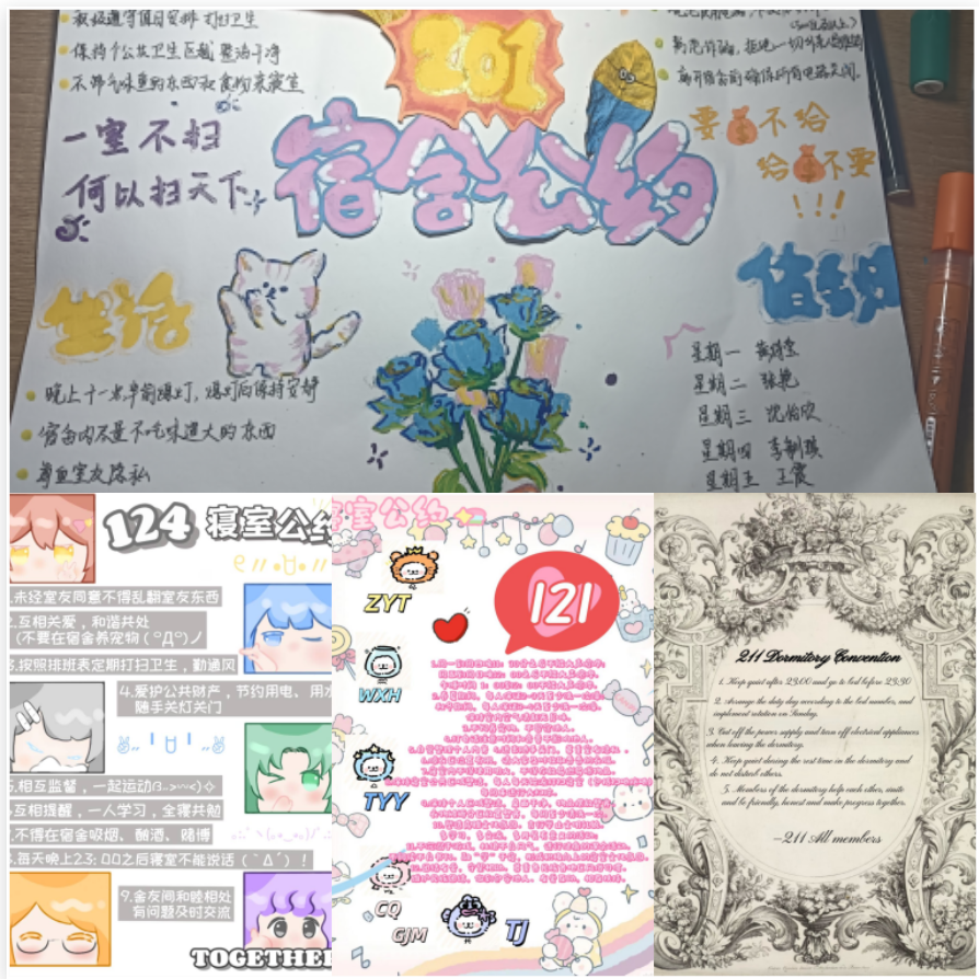 鑄牢中華民族共同體意識(shí),凝聚“大愛”力量。211名來自全國24個(gè)?。▍^(qū)、市)的2024級(jí)本科新生,組成共計(jì)40個(gè)宿舍參加了本次大賽。各宿舍成員在寢室長的帶領(lǐng)下共同商討、精心設(shè)計(jì)制作了形式多樣、展現(xiàn)宿舍特色的寢室公約,拍攝了寢室合照,并記錄了宿舍成員入學(xué)以來“寢”心協(xié)力的團(tuán)結(jié)故事,充分展示了寢室集體積極向上、團(tuán)結(jié)友愛的良好精神風(fēng)貌。一份份制作精美的寢室公約和一個(gè)個(gè)充滿溫情的寢室故事,不僅凝聚了每位成員的智慧和心血,更為宿舍成員留下了一段溫馨且難忘的集體記憶。