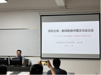 翁義明老師接下來(lái)以《借帆出海:翻譯助推中國(guó)文化走出去》為題,從翻譯與中國(guó)百年發(fā)展、中國(guó)文化走出去的戰(zhàn)略意義、中國(guó)文化外譯原則,以及中國(guó)文化外譯策略等四個(gè)方面對(duì)《習(xí)近平談治國(guó)理政》中的中國(guó)特色話(huà)語(yǔ)的英譯進(jìn)行了分析和探討,認(rèn)為這些中國(guó)特色話(huà)語(yǔ)的英譯,不但豐富了中國(guó)英語(yǔ)的內(nèi)涵,加強(qiáng)了話(huà)語(yǔ)的中國(guó)表達(dá),更堅(jiān)定了中國(guó)文化的自信。中國(guó)英語(yǔ)的兼容并蓄,以及其蘊(yùn)含的無(wú)限生命力,更符合在國(guó)際舞臺(tái)上的中國(guó)精神和中國(guó)形象。