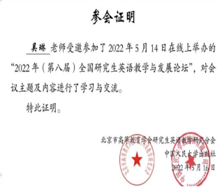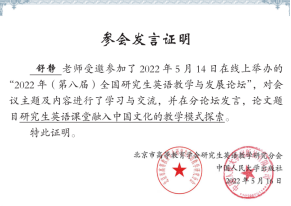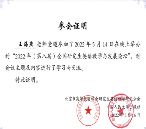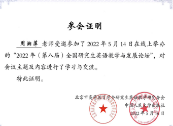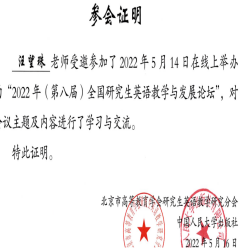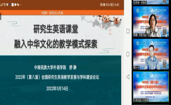2022年5月14日,研究生英語教研室老師參加“2022年(第八屆)全國研究生英語教學(xué)與發(fā)展論壇”,與全國從事研究生英語教學(xué)的老師們相聚云端,交流如何響應(yīng)黨和國家培養(yǎng)創(chuàng)新人才的新時代要求,探索研究生公共英語的教學(xué)理念和教學(xué)模式。