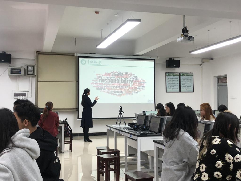 本次課程的主題是“責任”,陳老師的課程實施分為三個部分。首先她請同學們自我評估是否具有責任心,然后從企業(yè)面試的小視頻,參考“高校大學生就業(yè)能力結(jié)構(gòu)”調(diào)查的結(jié)果,引出“認真負責”是職場上最為重視的個人品質(zhì)之一,教導大家做有責任心的職場新人。課程第二個環(huán)節(jié)是激發(fā)學生對“大學生社會責任”的思考。陳老師在學習通發(fā)布搶答后,同學們積極發(fā)表各自見解,例如要熱愛祖國,關(guān)心國家大事;公平友善對待身邊的人和事;認真學習,對自己的學業(yè)負責。陳老師結(jié)合同學們的學習反饋,鼓勵大家制定規(guī)劃并身體力行,方能“修身,齊家,治國,平天下”;1801班的唐景雯同學也在這一環(huán)節(jié)分享了自己的學習經(jīng)驗,幫助大家共同進步。在課程第三部分,教師重點點評了同學們在學習通討論區(qū)提交的企業(yè)社會責任案例,指導同學們以“基于內(nèi)容”的英語學習方法,收集學習素材,提升語言能力。