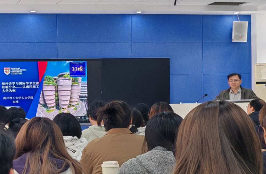 3 月 19 日下午,新加坡南洋理工大學中文系高級講師(副高級)、博士生導師崔峰應邀前來我院,為師生開展海外訪學與國際學術交流經驗分享,活動由我院學生工作辦公室副主任王斌老師主持,學院師生代表80余人參加。