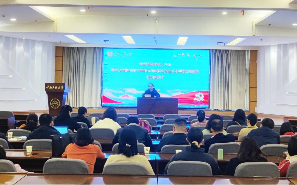 段超對外語學院主題教育工作提出了要求。一是學院黨委要嚴格按照上級黨組織和校黨委工作安排,抓好落實;二是要深刻理解理論學習的重要性,要有系統學習的自覺性;三是本次主題教育主要在處級干部中進行,但是普通黨員、黨外教師的理論學習也不能放松。他說,學院黨政對制約學院發展的問題找得準,在此次主題教育活動中,要充分調研,群策群力,逐步破解頑瘴痼疾。隨后,他以“圍繞鑄牢中華民族共同體意識做科研”為主題,從科學選題、嚴密論證、建構條件、掌握技巧4個方面,作了《外語學院如何申報國家社會科學基金項目》的輔導報告。