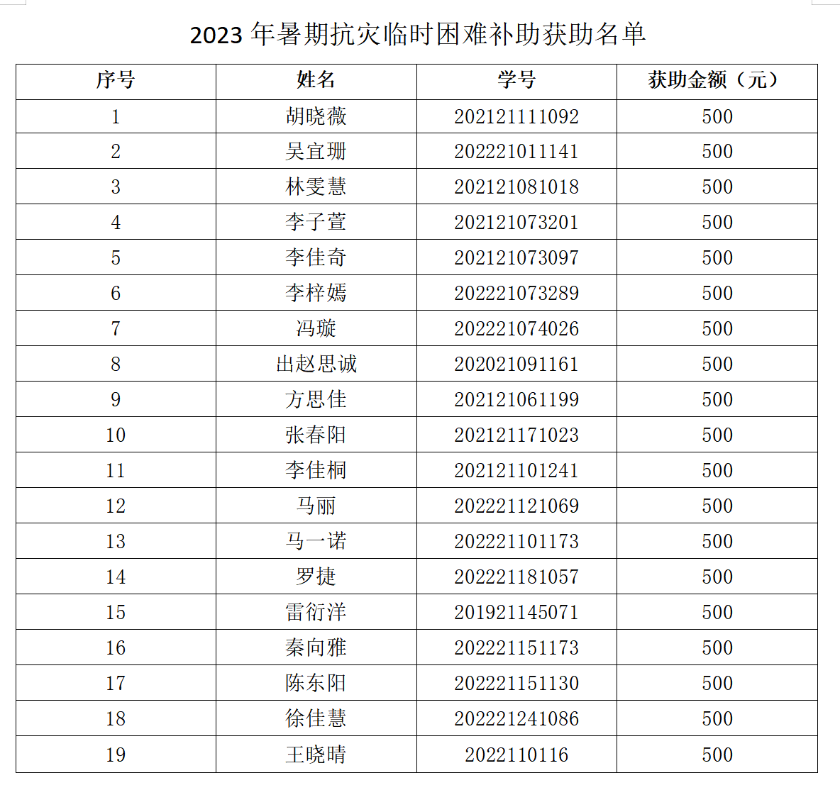 涓虹簿鍑嗗仛濂藉彈鐏懼湴鍖哄鐢熷府鎵舵晳鍔╁伐浣滐紝甯姪鍙楃伨鍦板尯瀛︾敓騫崇ǔ搴﹁繃鐏炬儏錛屾垜鏍′簬鏆戞湡寮閫氫簡鎶楃伨涓存椂鍥伴毦琛ュ姪閫氶亾銆傜粡瀛﹂櫌鑰佸笀鎽告帓鍜屽鐢熺敵璇楓佸闄㈠瀹氥佸厷濮斿宸ラ儴鏍稿噯錛屾渶緇堢‘瀹氫負(fù)鑳℃檽钖囩瓑19鍚嶅悓瀛﹀彂鏀炬姉鐏句復(fù)鏃跺洶闅捐ˉ鍔┿傚叿浣撳彂鏀懼悕鍗曞涓嬶細(xì)