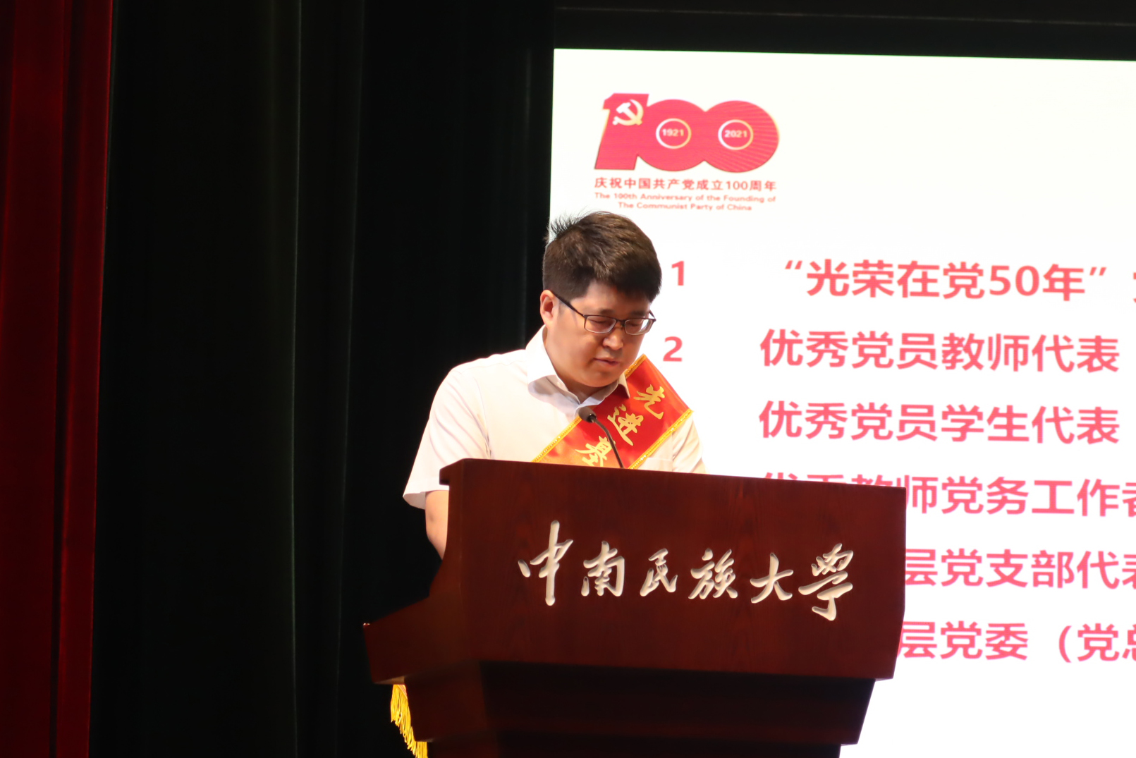 與會(huì)同志共同觀看了微視頻《中國(guó)共產(chǎn)黨百年述職報(bào)告》《你,為什么入黨?》。在莊嚴(yán)的國(guó)歌聲中,大會(huì)正式開幕。校黨委副書記白江源宣讀了《中南民族大學(xué)榮獲“光榮在黨50年”紀(jì)念章黨員名單》,校黨委副書記、副校長(zhǎng)宋發(fā)軍宣讀了“兩優(yōu)一先”表彰決定。校黨委常委為老黨員頒發(fā)“光榮在黨50年”紀(jì)念章,為受表彰的優(yōu)秀共產(chǎn)黨員、優(yōu)秀黨務(wù)工作者和先進(jìn)基層黨組織頒獎(jiǎng)。
