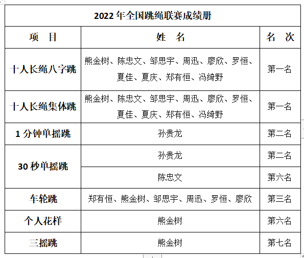 我校跳繩隊此次參賽,由體育學院院長郝家春任領隊,孫貴龍老師任主教練,共13名隊員參加了7個項目的角逐。熊金樹、陳忠文、鄒思宇、周迅、廖欣、羅恒、夏佳、夏慶、鄭有恒、馮綺野等10名隊員在十人長繩八字跳和十人長繩集體跳項目中表現優異,獲得兩項第一。孫貴龍老師分別參加了1分鐘單搖跳和30秒單搖跳的個人競賽項目,均獲第二名。