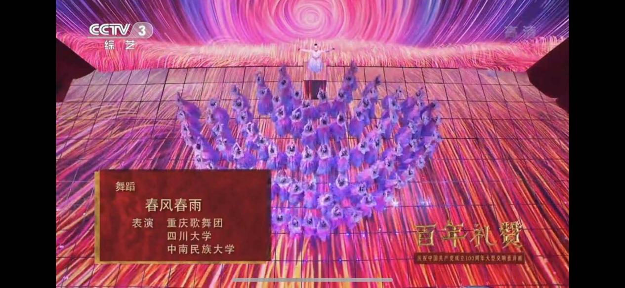 6月26日晚,中央廣播電視總臺《百年禮贊——慶祝中國共產黨成立100周年大型交響音詩畫》音樂會在央視三套盛大播出,我校音樂舞蹈學院60名學生受邀參演,出色完成了《前進!偉大光榮的黨》《春風春雨》《紅梅贊》《我的綠水青山》4個大型節目的排練演出錄制,向黨的百年華誕獻上了民大學子的深情祝福。