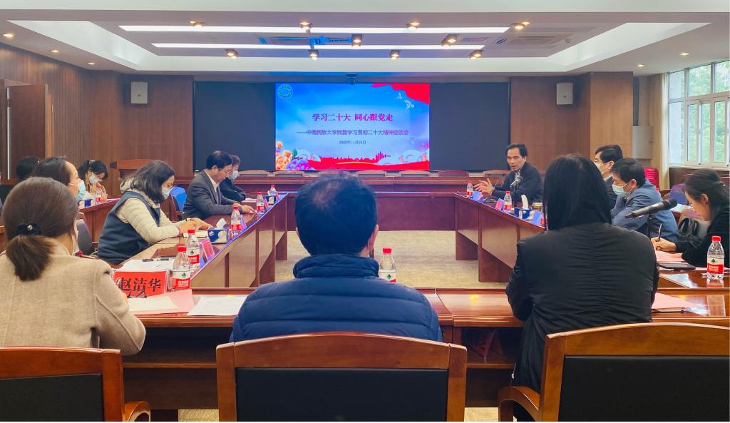 11月23日,民盟中南民族大學委員會召開“學習二十大 同心跟黨走”主題座談會,校長李金林宣講黨的二十大精神,黨委統戰部常務副部長唐光海及全體盟員參加會議。會議由民盟委員會主任委員付海燕主持。