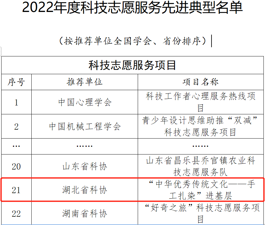 12月21日,中國科協官網公布2022年度科技志愿服務先進典型名單,我校民族學博物館科技志愿服務項目“‘中華優秀傳統文化——手工扎染’進基層”獲評2022年度中國科協“科技志愿服務項目”先進典型。