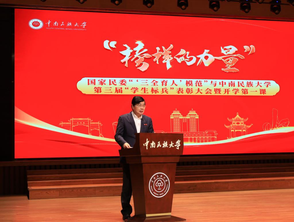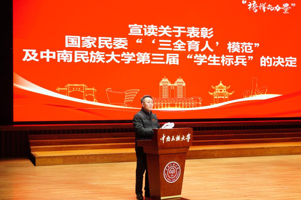 為落實立德樹人根本任務,鑄牢中華民族共同體意識,承擔起培根鑄魂職責使命,2月24日晚,我校舉辦國家民委“‘三全育人’模范”與校“優秀學生標兵”表彰大會暨開學第一課,以線上+線下的形式創新打造“大思政課”,全校師生在春季學期之始感受到“榜樣的力量”,凝聚起新時代青春力量。全體校黨委常委、各單位負責人、班導師及學生代表出席。大會同時開設分會場,全體班導師及全體在校學生參會,會議由校長李金林主持。