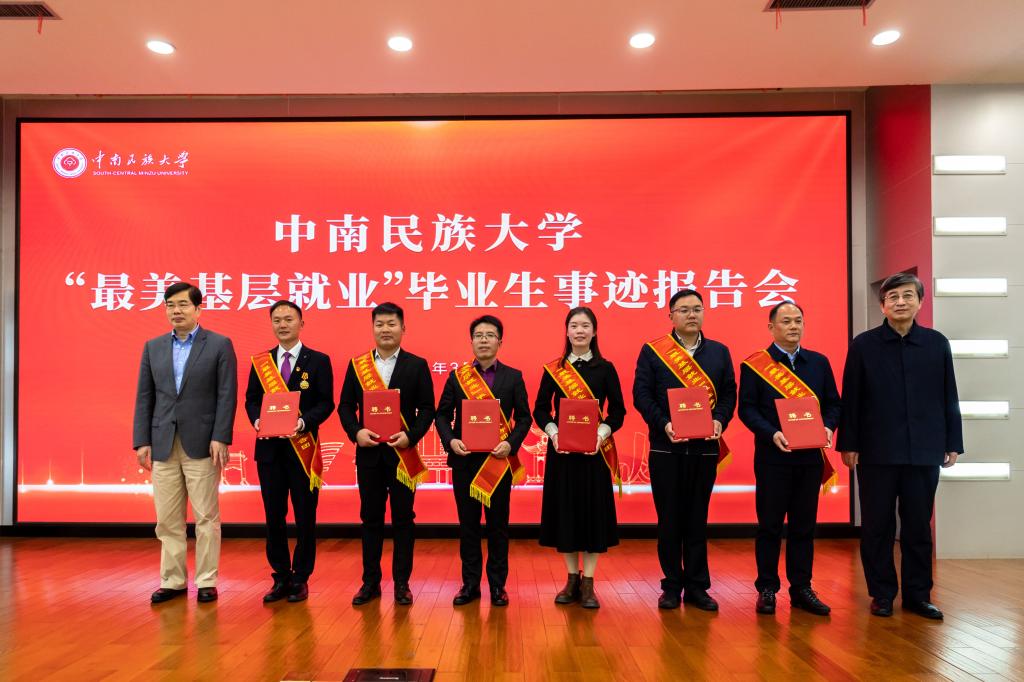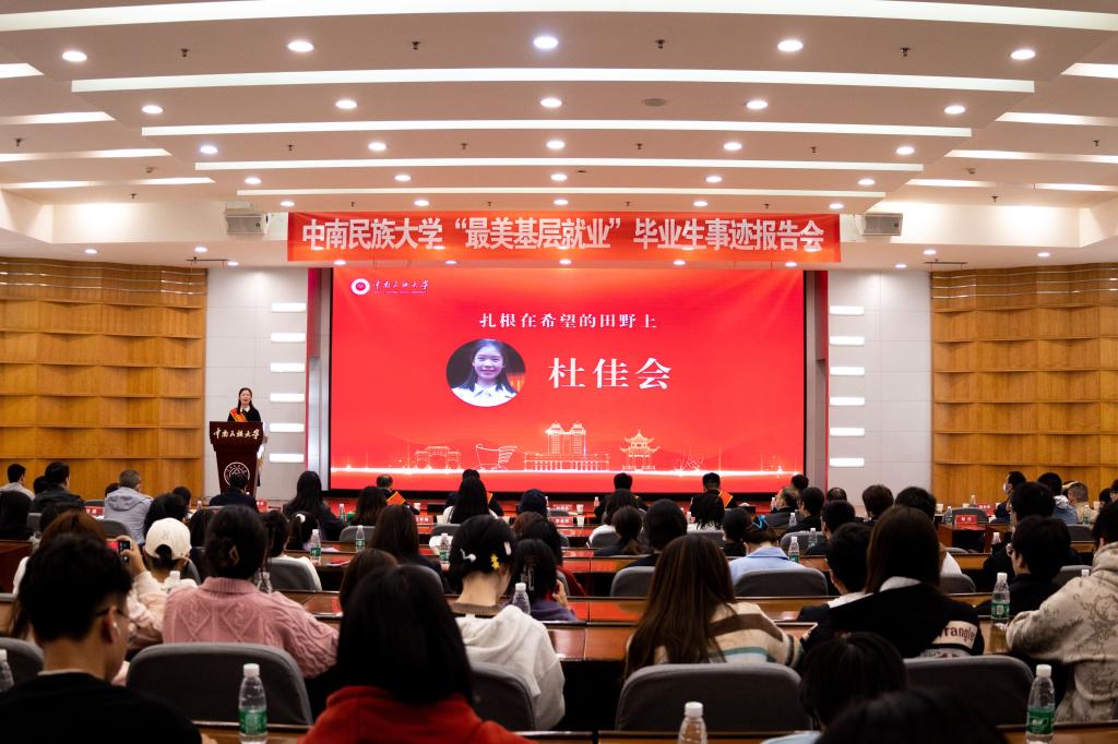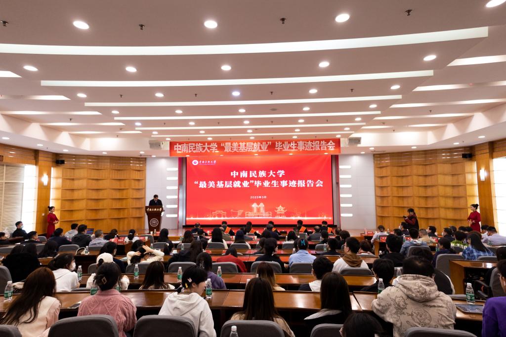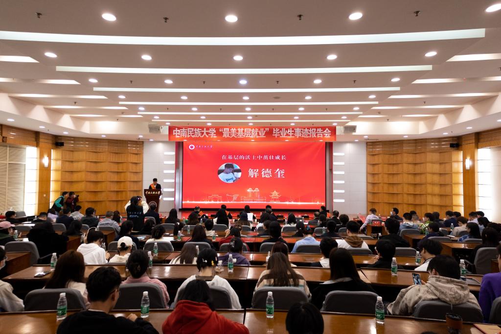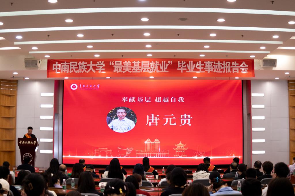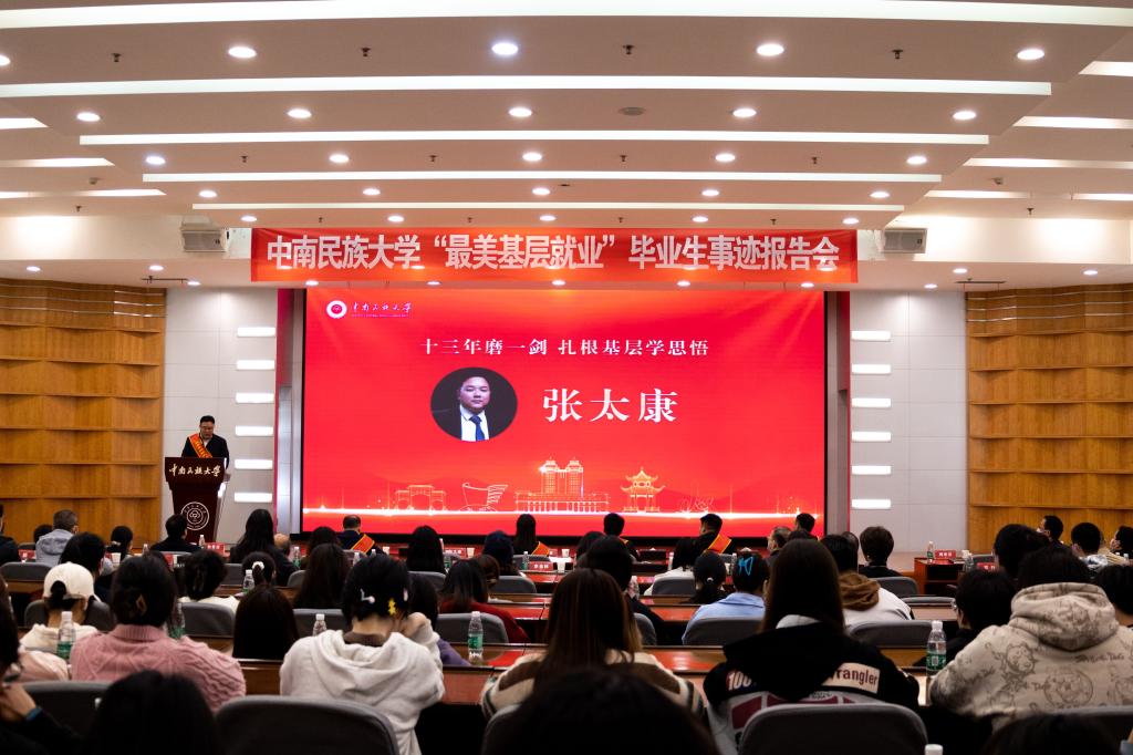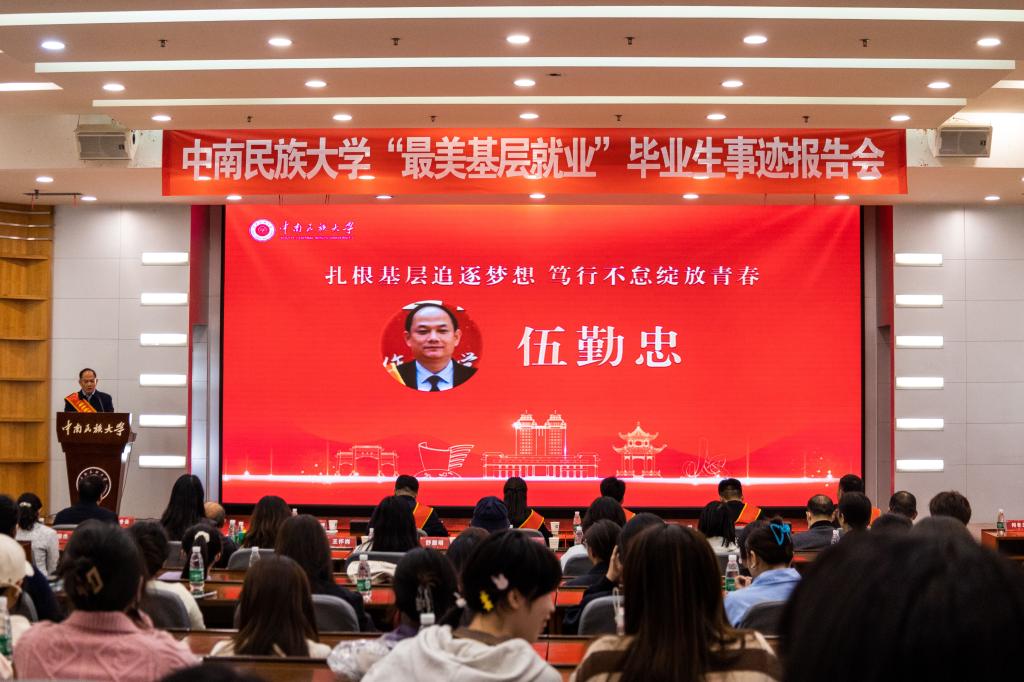 “近年來,中南民族大學認真貫徹落實上級有關精神,鼓勵學生腳踏實地,到祖國和人民最需要的地方去建功立業,涌現出一批批投身基層的畢業生?!备毙iL杜冬云介紹舉辦此次活動的初衷:“就業是民生之本。穩就業是當前學校工作面臨的重要任務。我們邀請來自全國各地最基層的6位校友舉行事跡報告會,分享他們在基層工作的故事,目的就是通過發揮榜樣的示范作用,引導廣大學生面向基層,到基層去,扎根基層,到祖國和人民最需要的地方去,與祖國同呼吸,與人民同命運,為中華民族的偉大復興貢獻力量?!?/p>