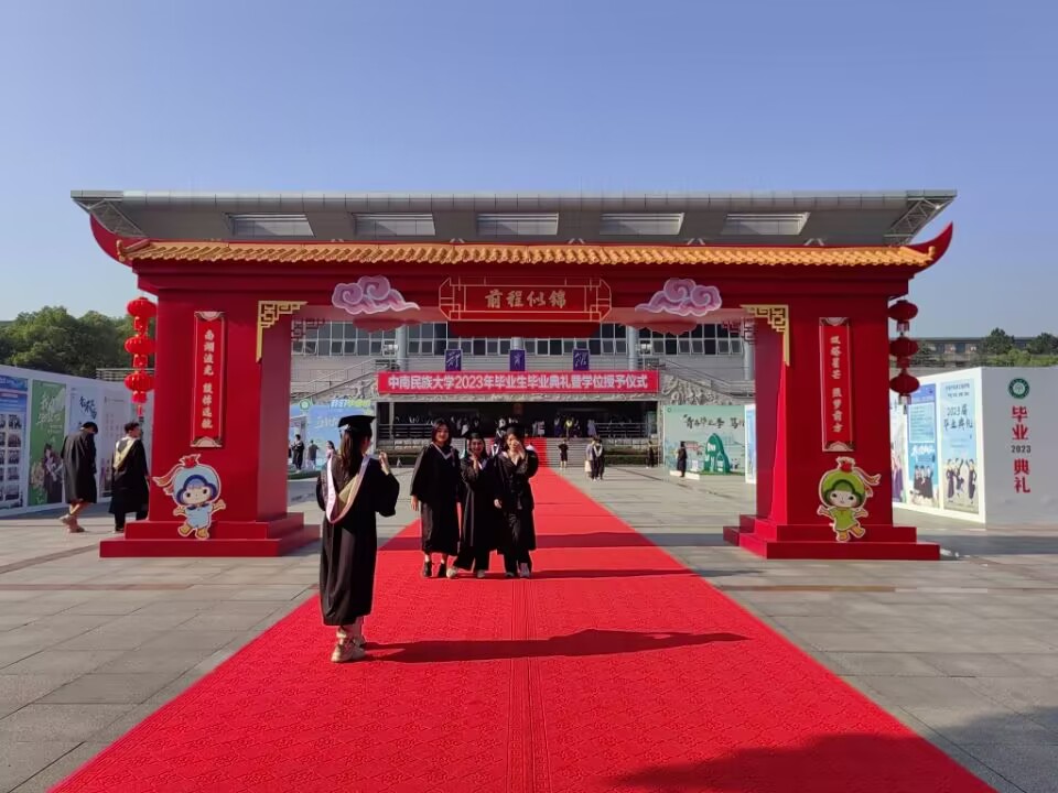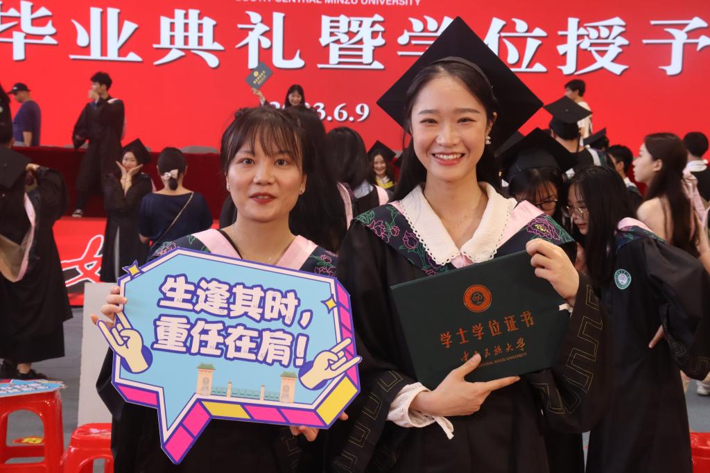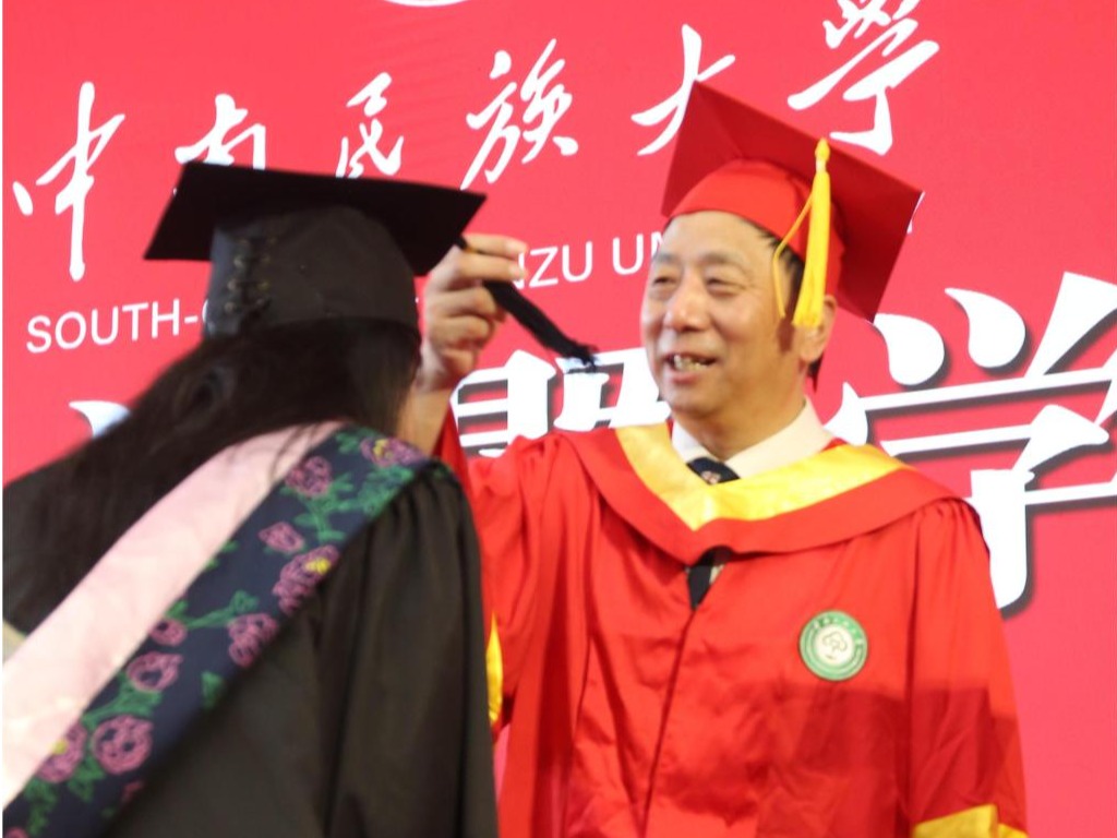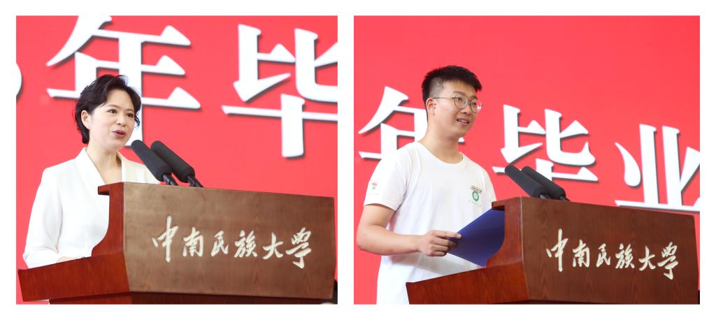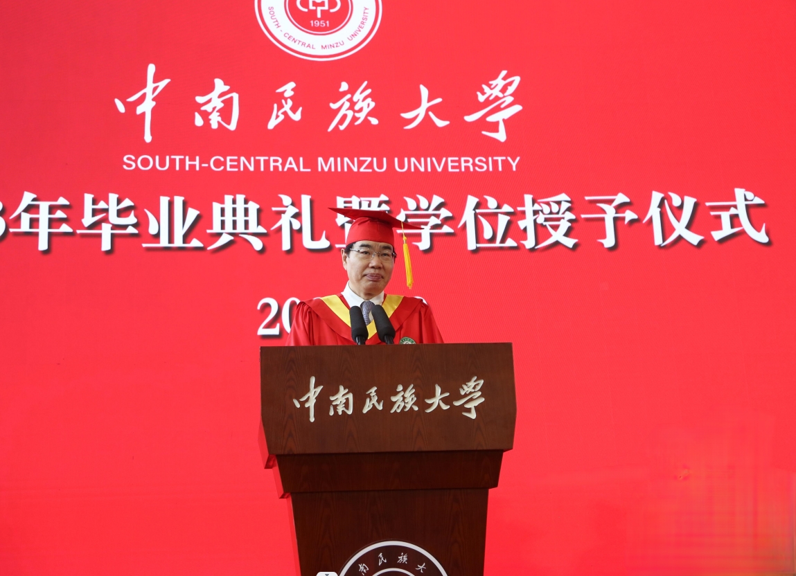 隨后,黨委副書記、副校長宋發軍宣讀了《關于表彰中南民族大學2023屆優秀畢業生的決定》《關于聘任2023屆畢業生“年級校友理事”“校友聯絡員”的決定》,學校領導為畢業生代表頒發畢業證書,為“年級校友理事”“校友聯絡員”代表頒發聘書。學校學位評定委員會主席、副校長段超宣讀學位授予文件。
