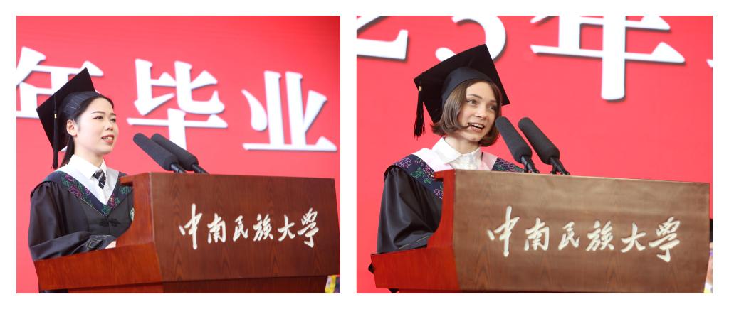 來自哈薩克斯坦的熙雯作為來華留學生代表發言。她回憶起自己的大學生活,感謝學校師友對她的幫助和照顧:“這期間我不僅在課堂上學到了很多專業知識,還在生活中、參與的各類文化活動中感受到了中華文化的美妙,感受到中國56個民族的師生交往交流交融的美好與和諧。作為傳播友誼的當代大學生,我們一起努力,共創美好、祥和的未來!”