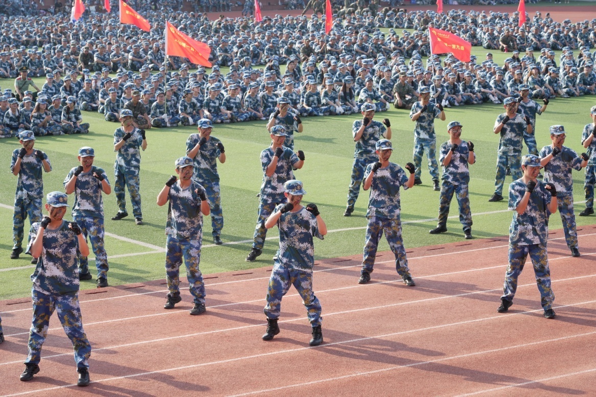 在莊嚴(yán)雄壯的國歌聲中,五星紅旗冉冉升起,全體參會人員面向國旗行注目禮。2022級學(xué)生組編成5個營47個連進行匯報表演。整齊劃一的方陣步伐,嘹亮高亢的口號喊聲,展現(xiàn)了同學(xué)們的訓(xùn)練成果和颯爽英姿。方隊匯報結(jié)束后,擒敵拳、匕首操和教官方陣的擒敵術(shù)表演將大會推向高潮。男子擒敵拳方陣在教官的號令下迅猛出拳,行云流水又剛強有力的動作詮釋了男兒自強的飽滿精神與自信昂揚。女生方陣的匕首操一招一式皆剛?cè)岵瑹o不體現(xiàn)著“巾幗不讓須眉”的四溢神采。教官方陣的表演則展現(xiàn)了中國軍人的矯健身姿和凜然偉岸。