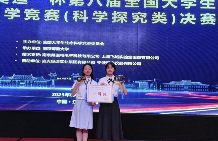 一等獎團隊代表何流小溪和程鈺潔在頒獎現場。 生科學院供圖